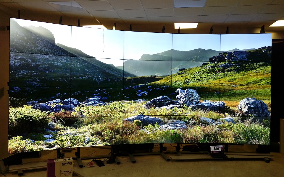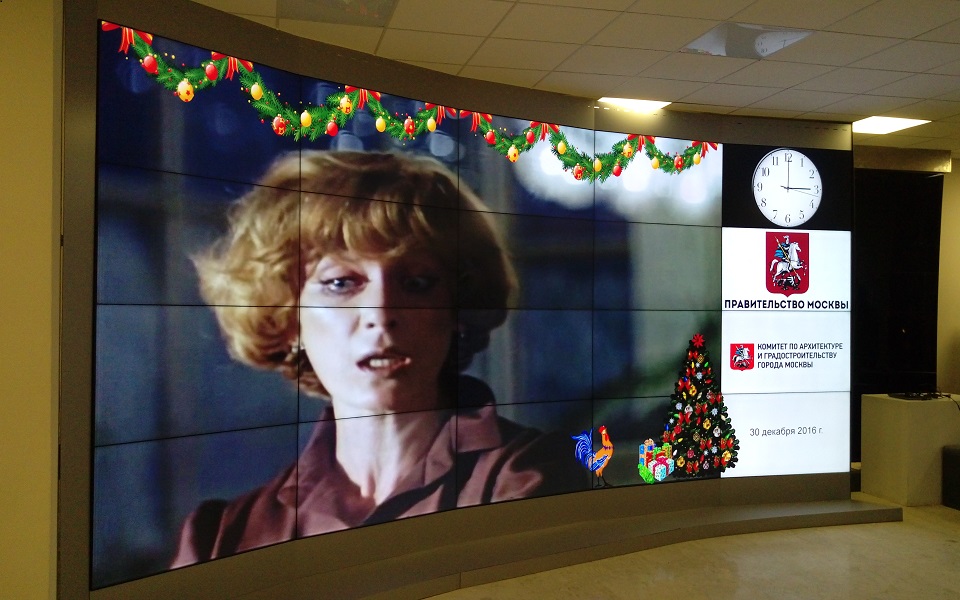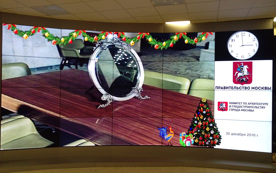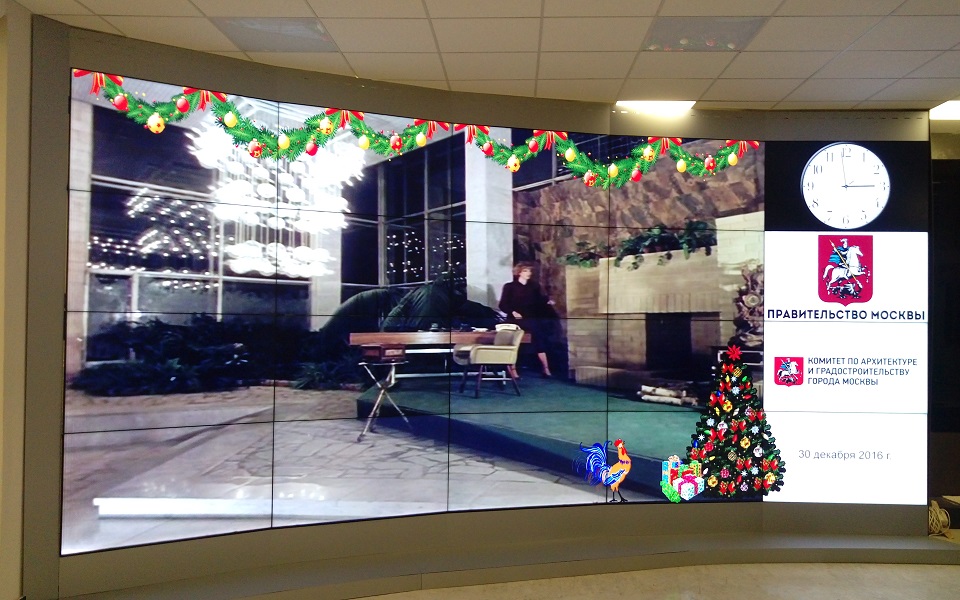 Видеостена из 20 LCD панелей с тонким кантом 1.5 мм установлена при входе в Комитет в месте непрерывного движения посетителей и сотрудников организации. Экран предназначен для вывода разнообразной информации в многооконном режиме. Для управления отображением используется ноутбук с установленным клиентским ПО и Андроид-планшет.