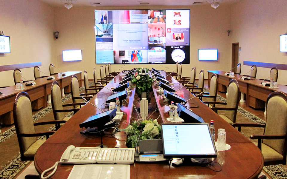 Ситуационный центр Губернатора Московской области оснащен средствами визуализации информации с использованием видеостены из 12 бесшовных видеокубов 67″ и видеопроцессора VCP для связи с областями МО в реальном времени.